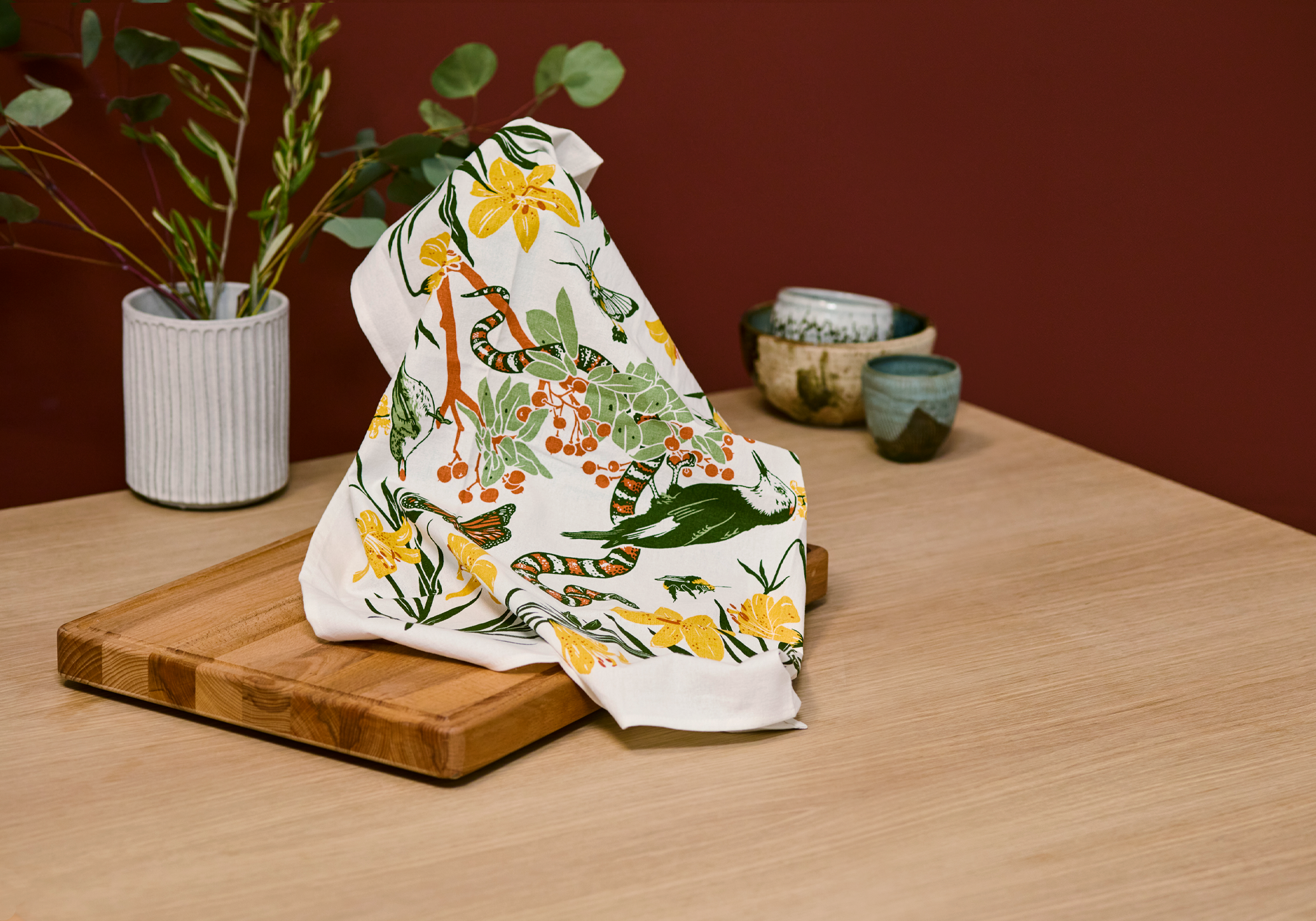 This is a beautiful tea towel that I bought (along with the Channel Islands tea towel) as a gift set for a friend in England I'll be visiting soon. I have the Berries tea towel myself and know from experience how nice it stays over time. It gets even better after repeated washings. It's not just pretty, but also works great as a lint free way to dry dishes, particularly glassware. I also have to mention how beautifully packaged my order was--obviously great care was taken there. I love Elizabeth's art and hope that these towels will make my English friend smile as much as mine does me : ) Thank you!