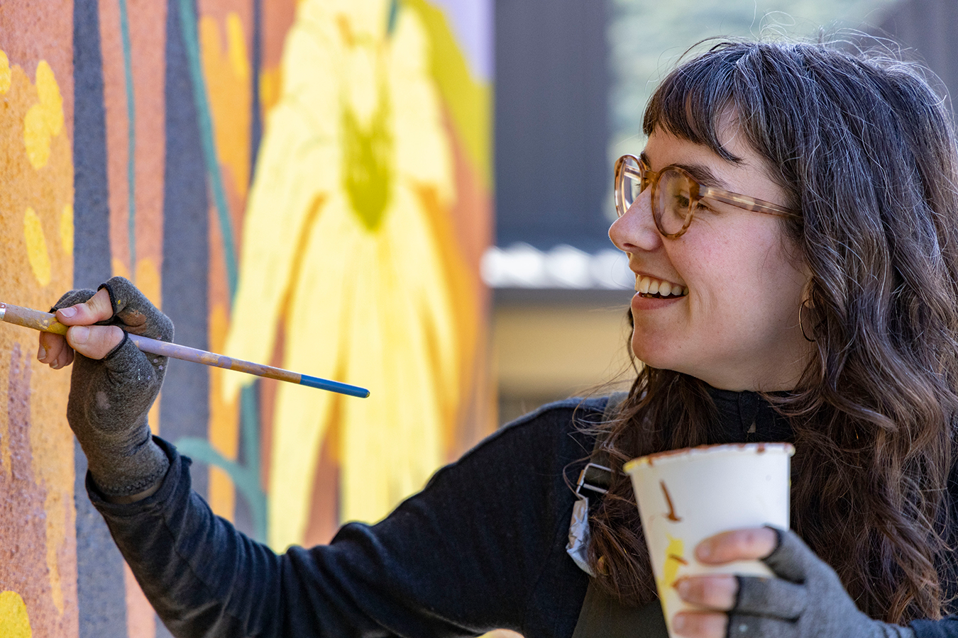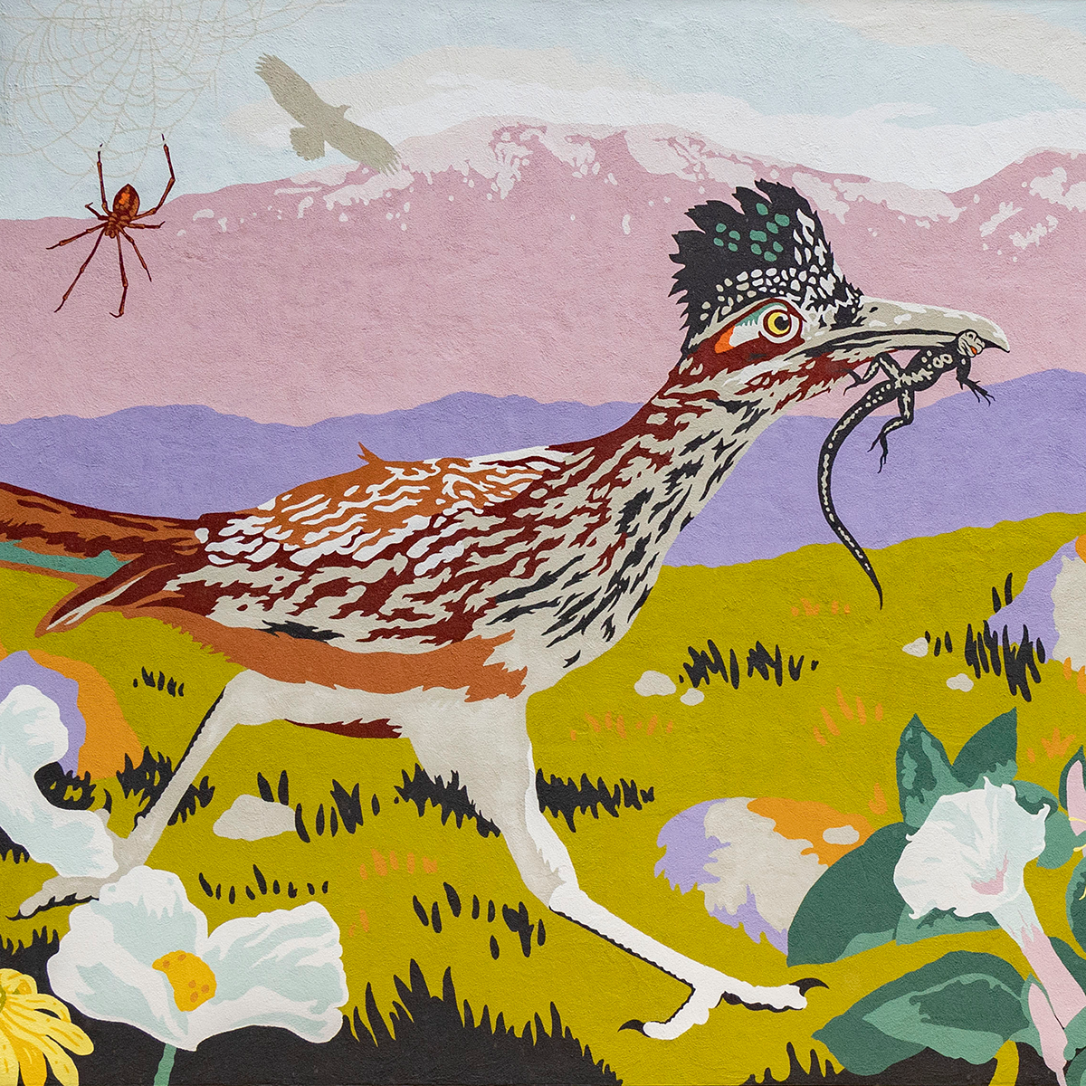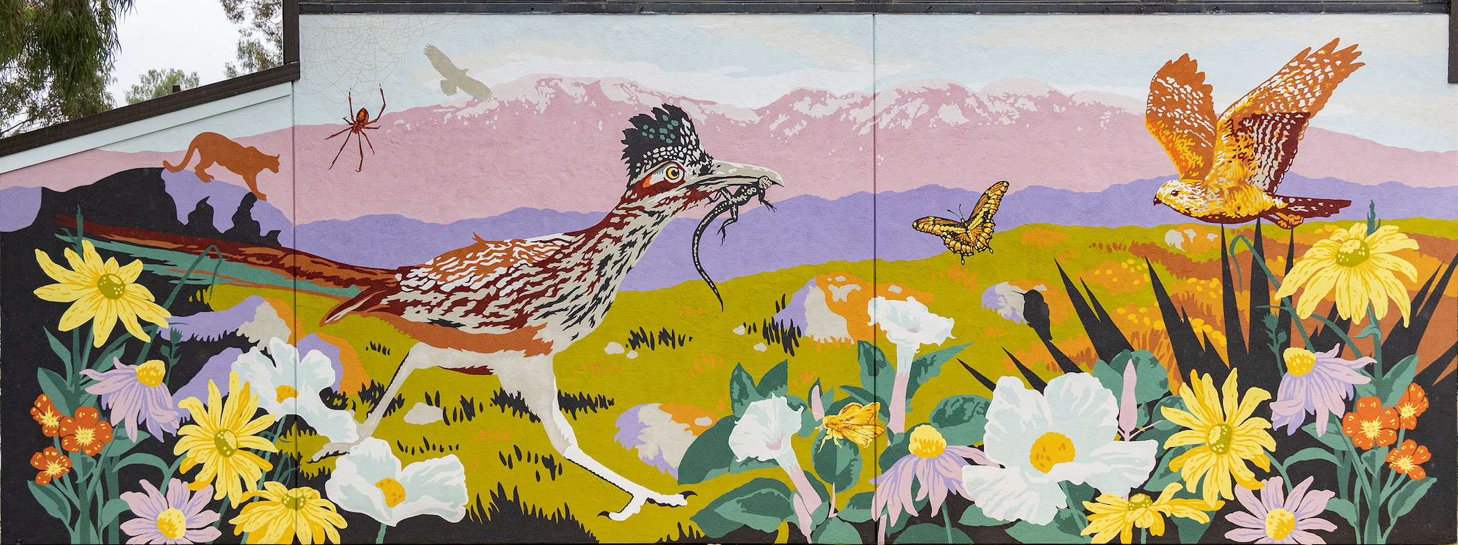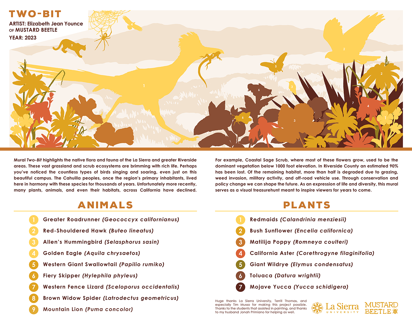 Two-Bit is a 14x40’ painting on the side of the Printmaking Studio at La Sierra University in Riverside, CA. The piece is named for Mount Two-Bit which lies just beyond this wall. The design depicts flora and fauna native to the Riverside and specifically La Sierra area, as if you were standing atop Two-Bit, looking Eastward to the snowy peaks of San Bernardino and beyond. The mural features a sign which further describing the design, shown below.