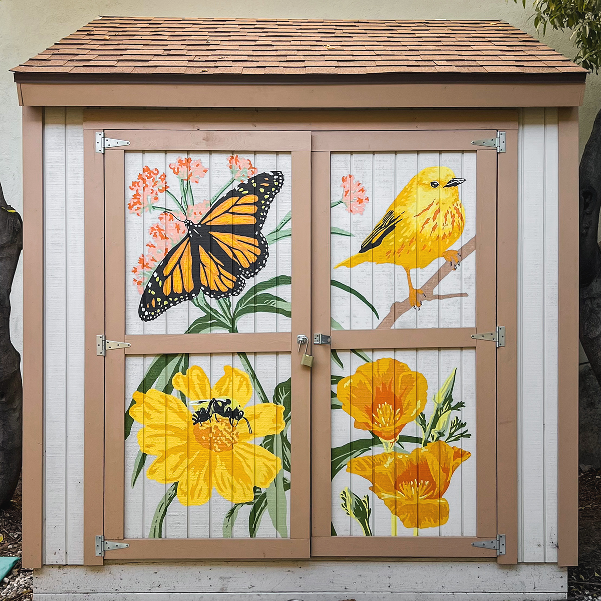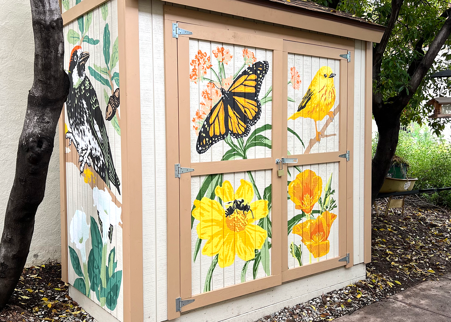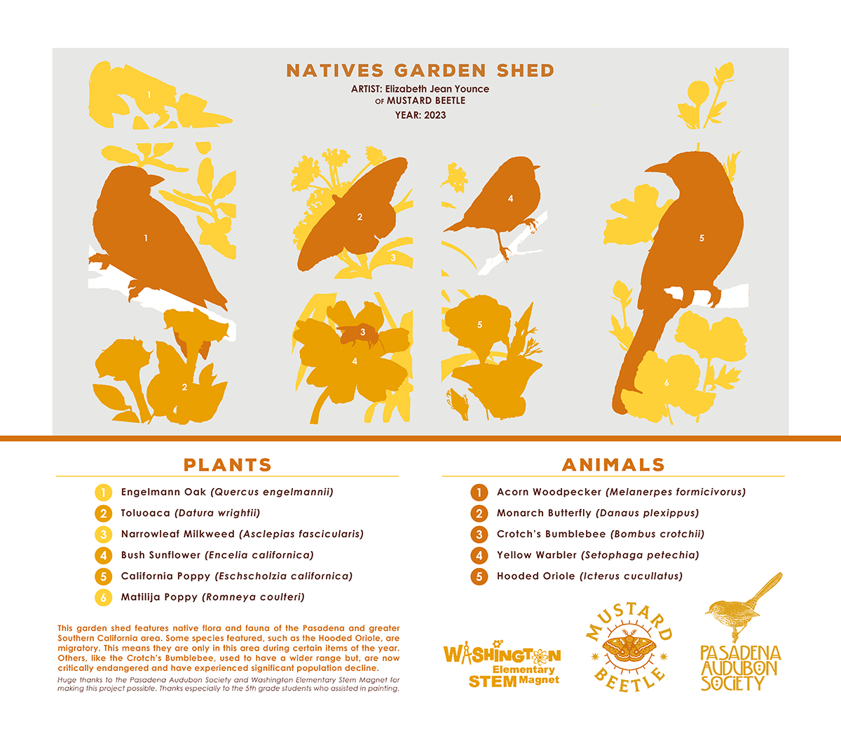 Audubon Shed is a painting on, you guessed it, the shed in the Pasadena Audubon Society's Native Plant Garden, at Washington STEM Elementary in Pasadena, CA. The design depicts flora and fauna native to Southern California and specifically Pasadena area. A group of 5th graders assisted in painting this project. The mural features a sign which further describing the design, shown below.