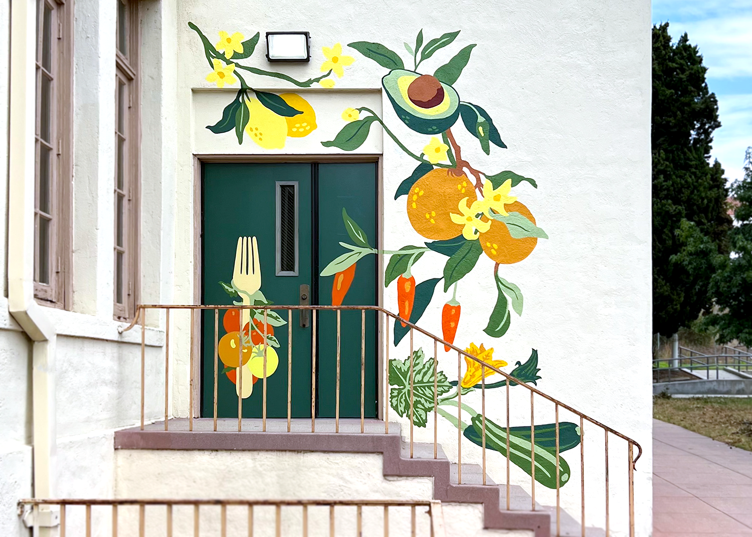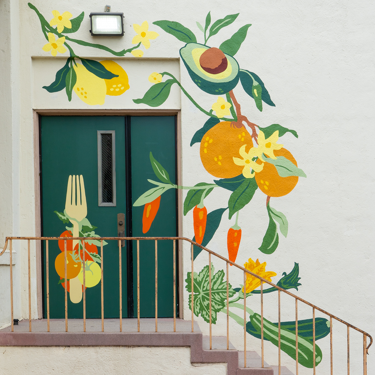 Farm to Table is a approximately a 130x150" painting surrounding the doorway to the Children's Kitchen within the Imagination Workshop at Washington STEM Elementary in Pasadena, CA. The design depicts fruits and vegetables that the students have a chance to grow in their garden, then get to prepare as dishes.