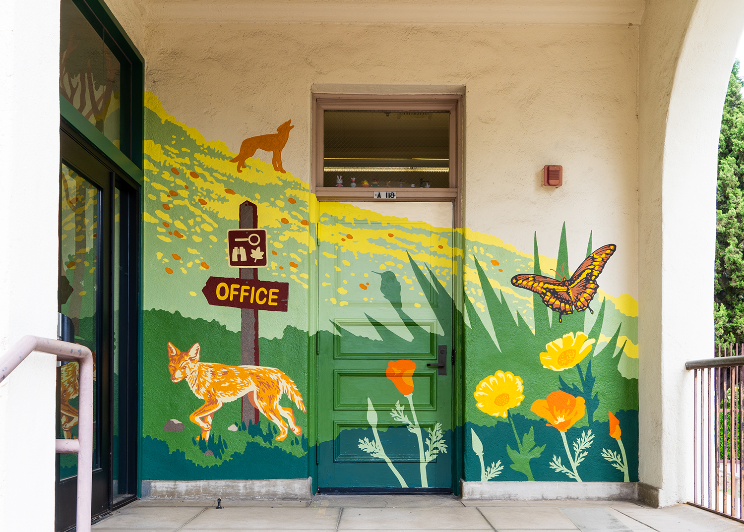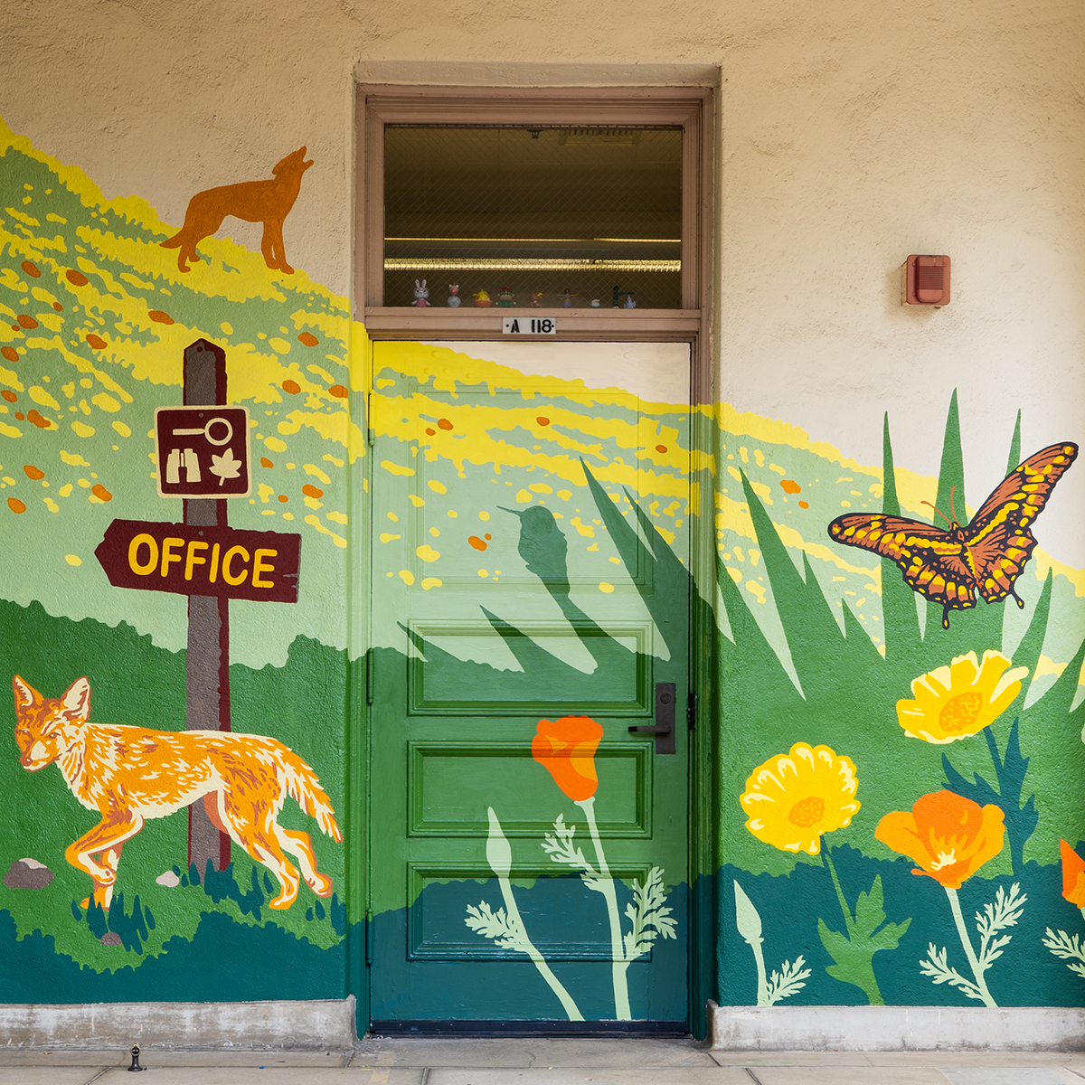Forest Lobby is a fully immersive painting that fills the lobby of, you guessed it, Washington STEM Elementary in Pasadena, CA. Tree tops stretch onto the high ceilings and the piece bleeds outside, camouflaging an unused door. The design depicts flora and fauna native to California. As you enter the lobby, the exterior highlights a Coastal Sage Scrub environment which bleeds into a Chaparral, Oak Woodland, and a Coniferous Forest with the centerpieces of the room featuring Giant Sequoia's.