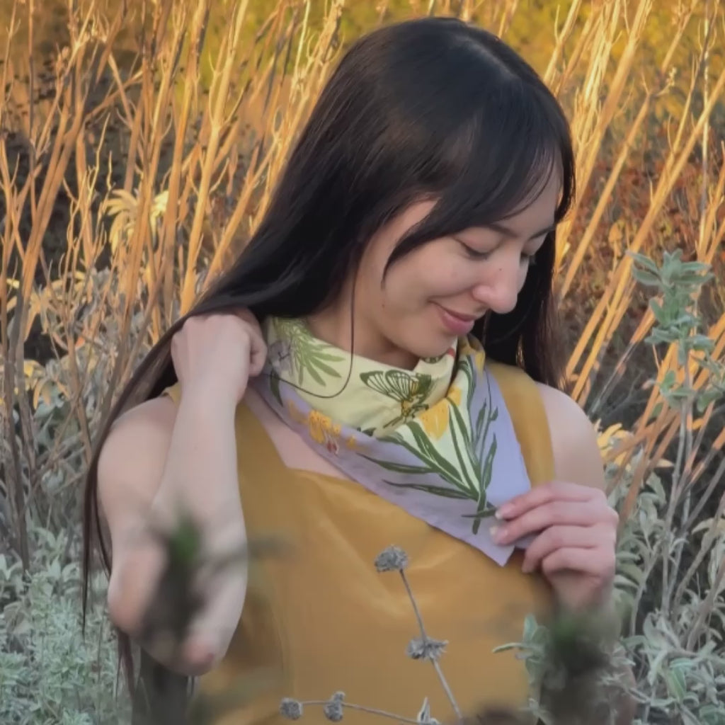 This item is a limited edition Bandana of an original illustration "San Jacinto" featuring White-headed Woodpecker, Snowplant, Coast Mountain Kingsnake, Pygmy Nuthatch, Lemon Lily, Yellow-faced Bumble Bee, Pinkbract Manzanita, San Jacinto Lupine, Shy Mariposa Lily, Monarch, & Rocky Mountain Clearwing.