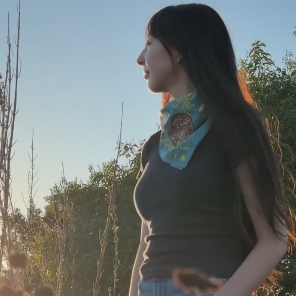 This piece is so beautiful with all the details. It is my favorite bandana and I wear it often. I was wearing it the other day around my neck with the burrowing owl facing out, and I saw an actual burrowing owl that day. I forgot I was wearing it, until I got home and looked in the mirror. It is very nice quality, and very soft. I highly recommend it.